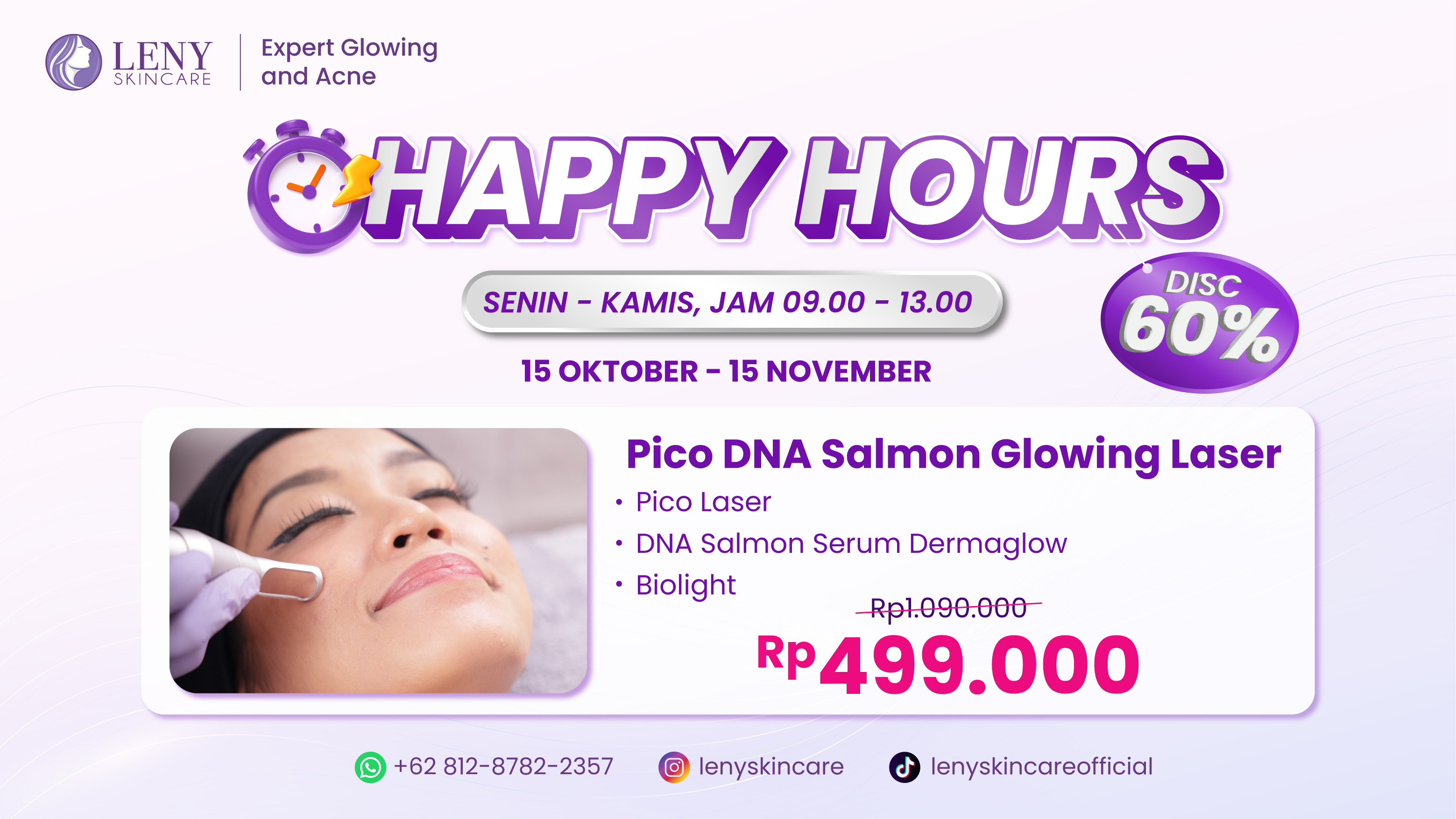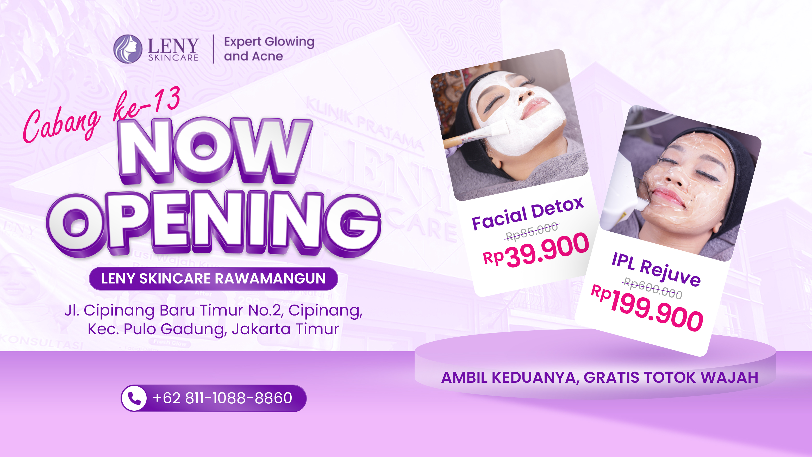 Leny Skincare adalah klinik kecantikan di Tangerang yang telah dipercaya ribuan pelanggan untuk mendapatkan kulit sehat, cerah, dan terawat. Selain di Tangerang, kami juga hadir di kota terdekat seperti Bekasi, Karawang, dan Depok, sehingga Anda bisa menemukan perawatan terbaik tanpa harus bepergian jauh.